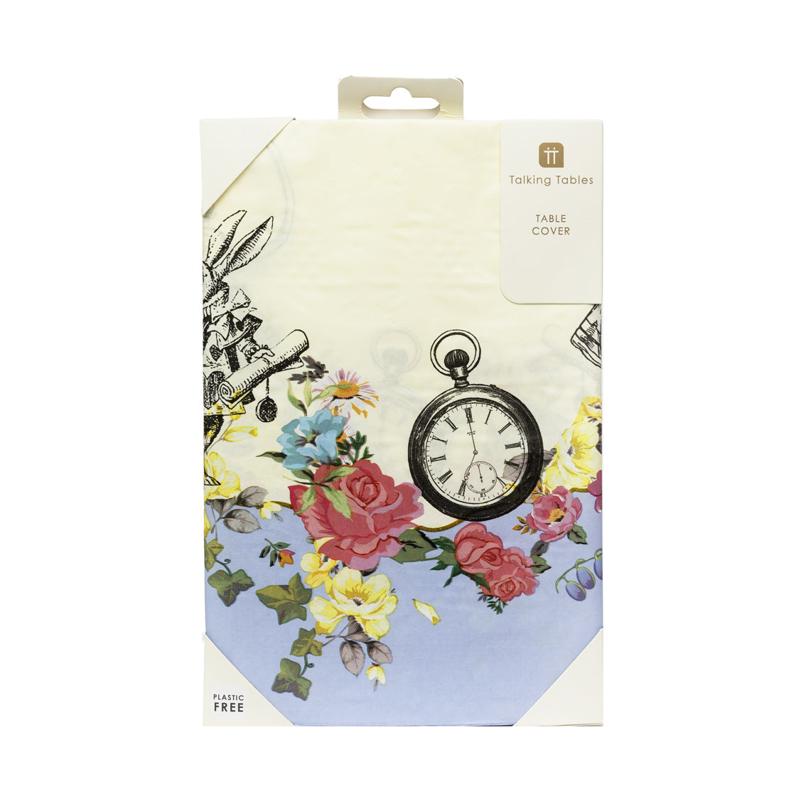 Adorned with flowers and Alice in Wonderland characters this recyclable table cover is the newest addition to our Alice in Wonderland range. The light blue colour borders the table cover with a cream middle where plates with cakes and sandwiches will go. Perfect for Alice in Wonderland themed parties for kids or a cute tea party for adults.