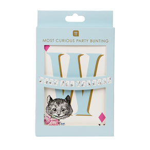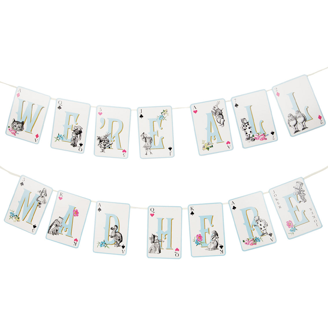 The most fitting paper bunting for your customers Mad Hatters tea party, because we're all a little bit mad here. Each letter is on a card from a playing deck with the letters in a light blue like Alice's dress. You can also spot different characters from the book on each playing card, which is your favourite?