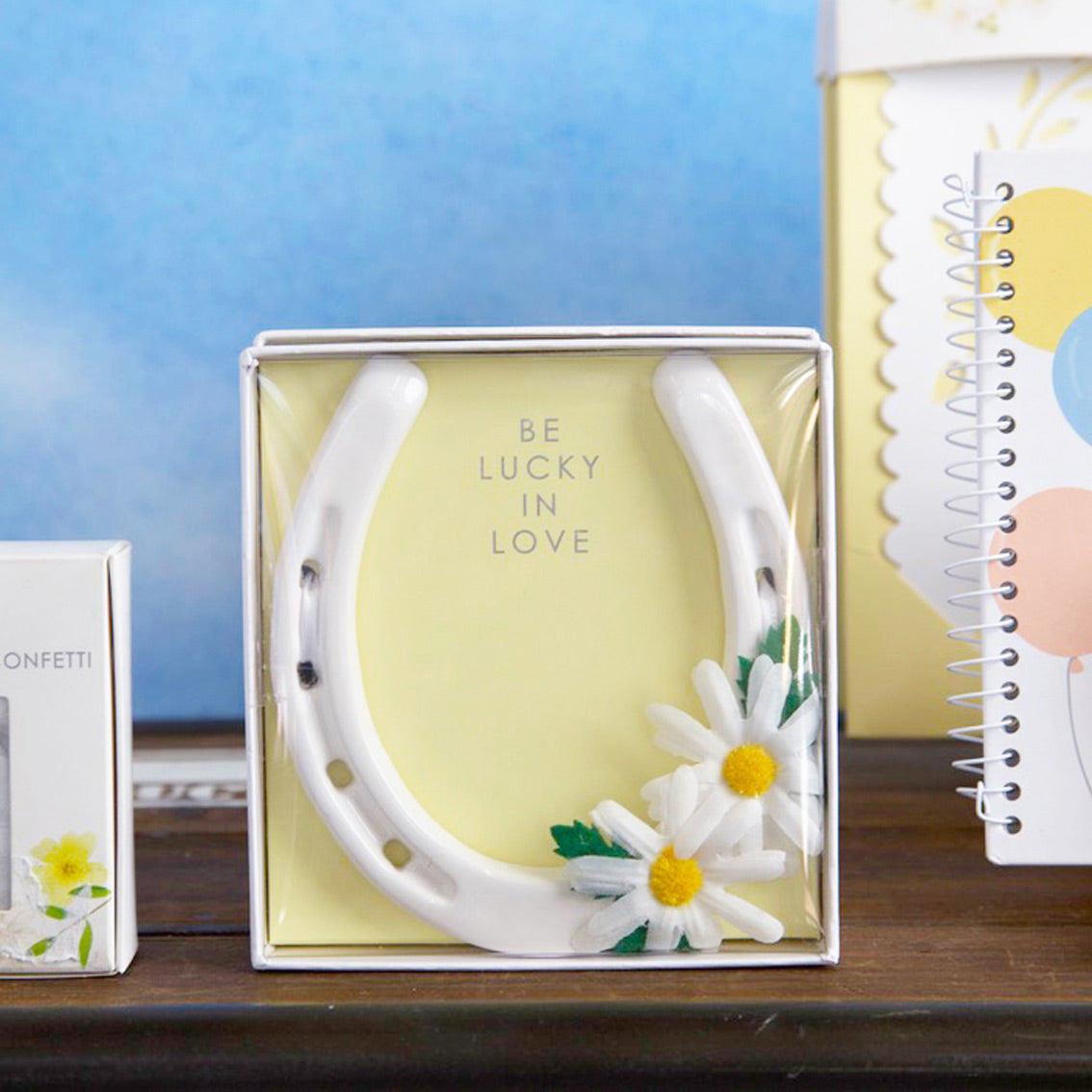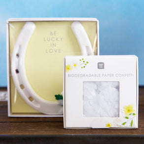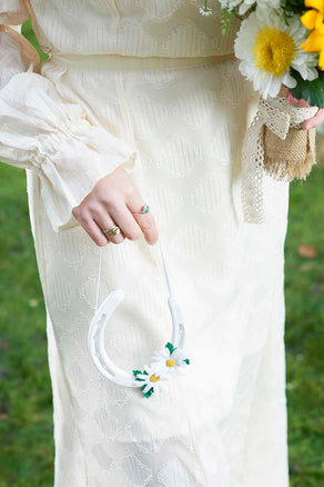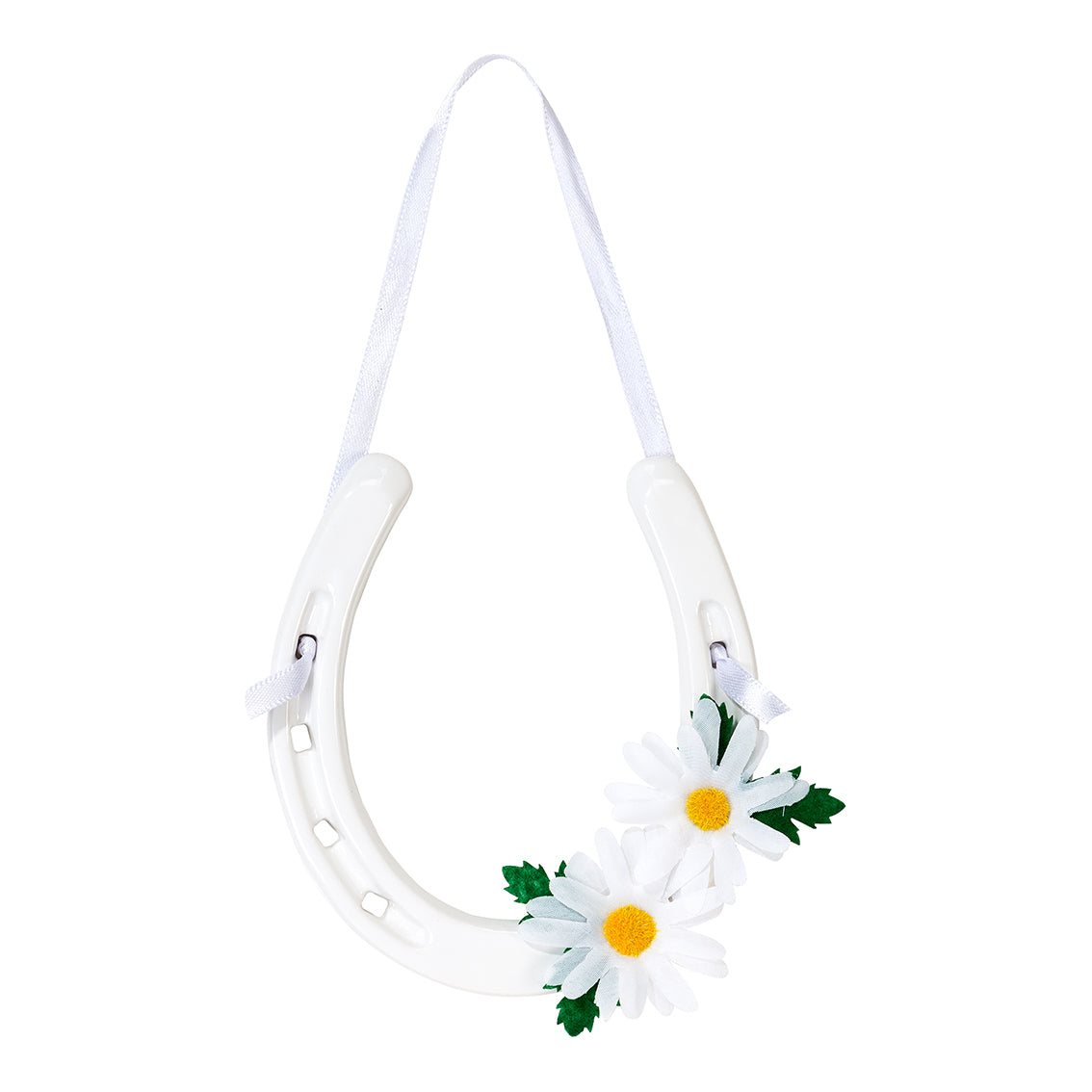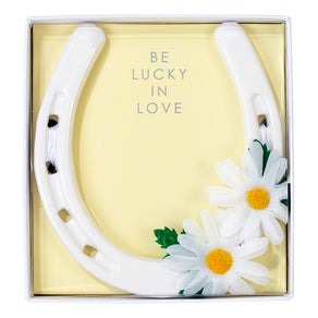 White lucky horseshoe wedding gift with daisy flower trim. Keep with tradition by gifting the bride a ceramic horseshoe hanging decoration to bring good luck to the newlyweds. The perfect wedding day keepsake for years to come and a traditional wedding gift.