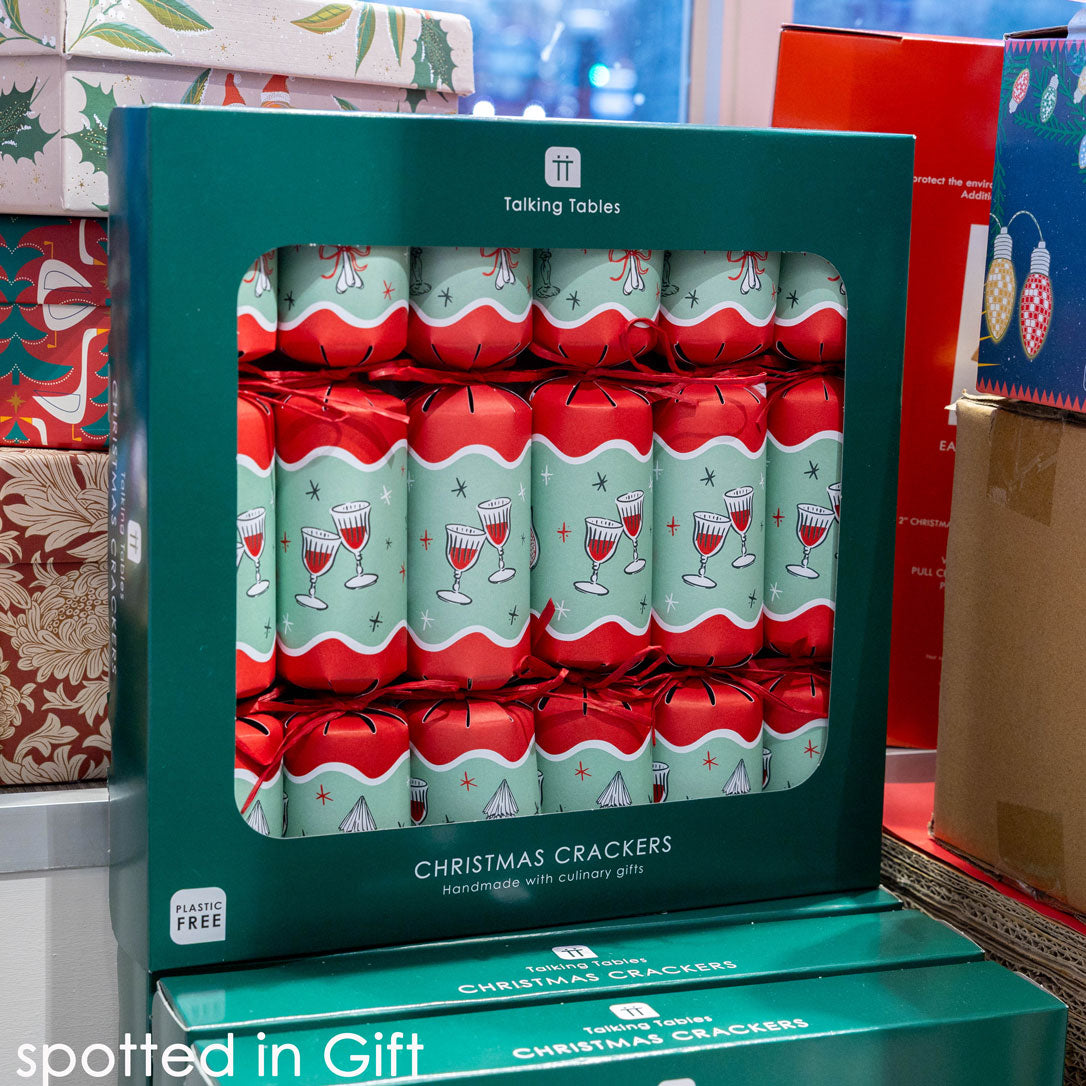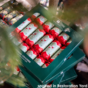 Dress the table in festive elegance with these Bon Noel Green Christmas Crackers. With a soft Christmas palette and Talking Tables icons detailing. Each cracker is handmade in South Africa and contains a paper hat, joke, and culinary gift. A refined choice for Christmas dining.