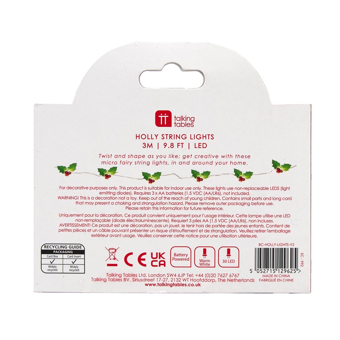 Add a twinkle to your Christmas table with Holly String Lights by Talking Tables. These holly shaped LED lights are the perfect decoration for adding a pop of colour and festive touch to your Christmas table, mantlepiece, banister or in a jar as a table centrepiece! Each pack contains a 3m (10ft) string of mini holly LED lights.