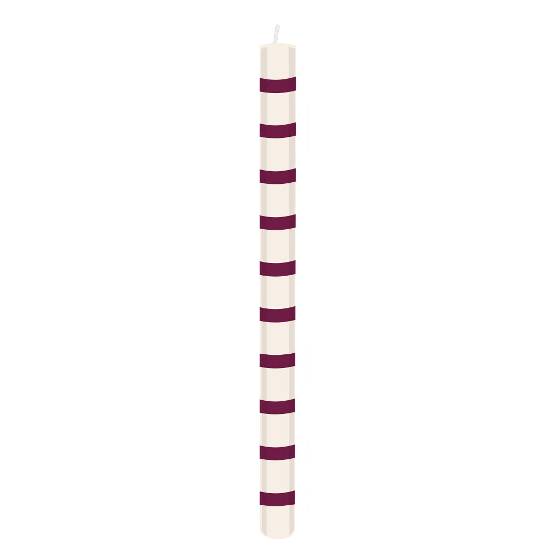 A straight dinner candle finished with a printed burgundy stripe on a soft white base. The repeated stripe gives a clean, structured look, while the rich burgundy tone sits comfortably within autumnal and winter table settings. Each candle burns for up to nine hours. Supplied in a ready to use display unit containing 25 candles, designed for clear, space efficient merchandising.
