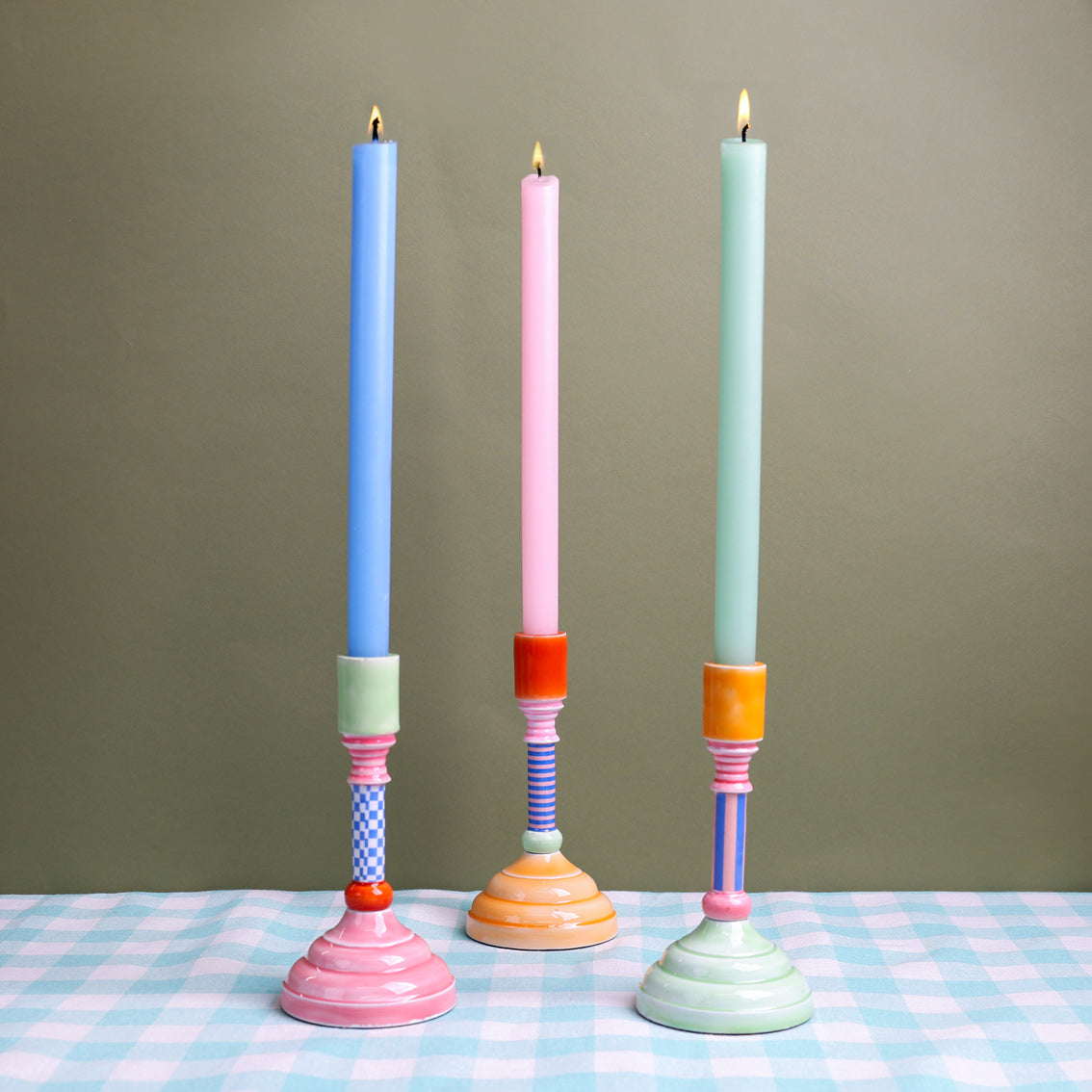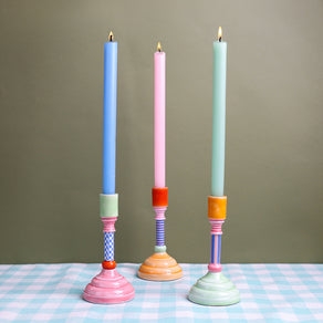 Our Bon Appetit brilliantly, bold patterned candle holders will steal the show in store. Crafted from hardwearing enamel, they come in a timeless silhouette and fit standard tapered candles. Available in three, striking colourways.