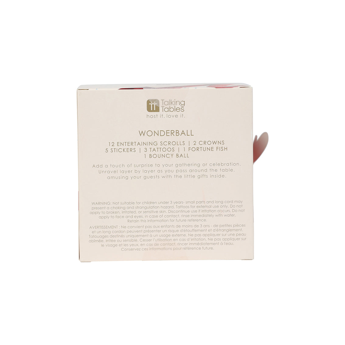 Contents: 12 entertaining scrolls, 2 crowns, 5 stickers, 3 tattoos, 1 fortune fish, 1 bouncy ball