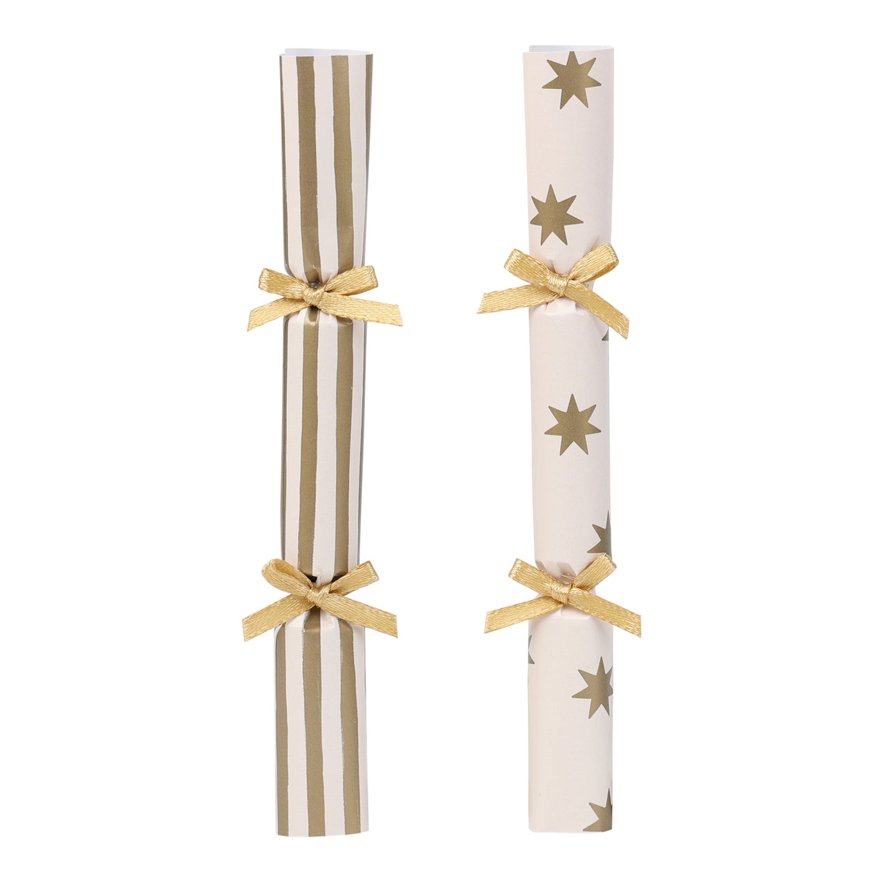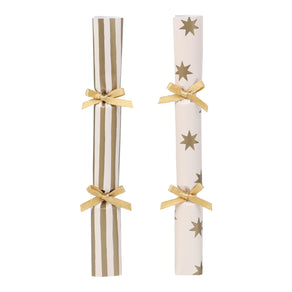 A compact cracker designed for smaller place settings and slower moments around the table. The Gilded range uses a soft cream base with refined gold striping and star motifs, keeping the look calm and considered rather than overly festive. Saucer sized proportions make these crackers ideal for afternoon tea, dessert plates or coffee with friends. Each cracker is hand filled and finished with a snap, delivering the full pulling experience in a more subtle format.
