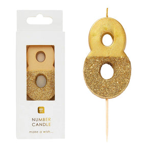 Celebrate your special big day with this number 8 gold glitter dipped candle. Mix and match with other numbers, also available in blue and pink. Perfect for popping on a special birthday cake!