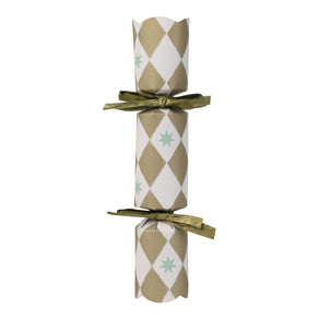 A compact cracker with a refined edge, designed for modern festive tables. The Gilded colour palette pairs soft neutrals with gold detailing, while the harlequin pattern and star motifs add structure without feeling busy. Mini in size, these crackers are suited to smaller place settings, drinks tables or informal gatherings. Each cracker is hand filled and finished with a traditional snap, balancing considered design with a proper Christmas pull.