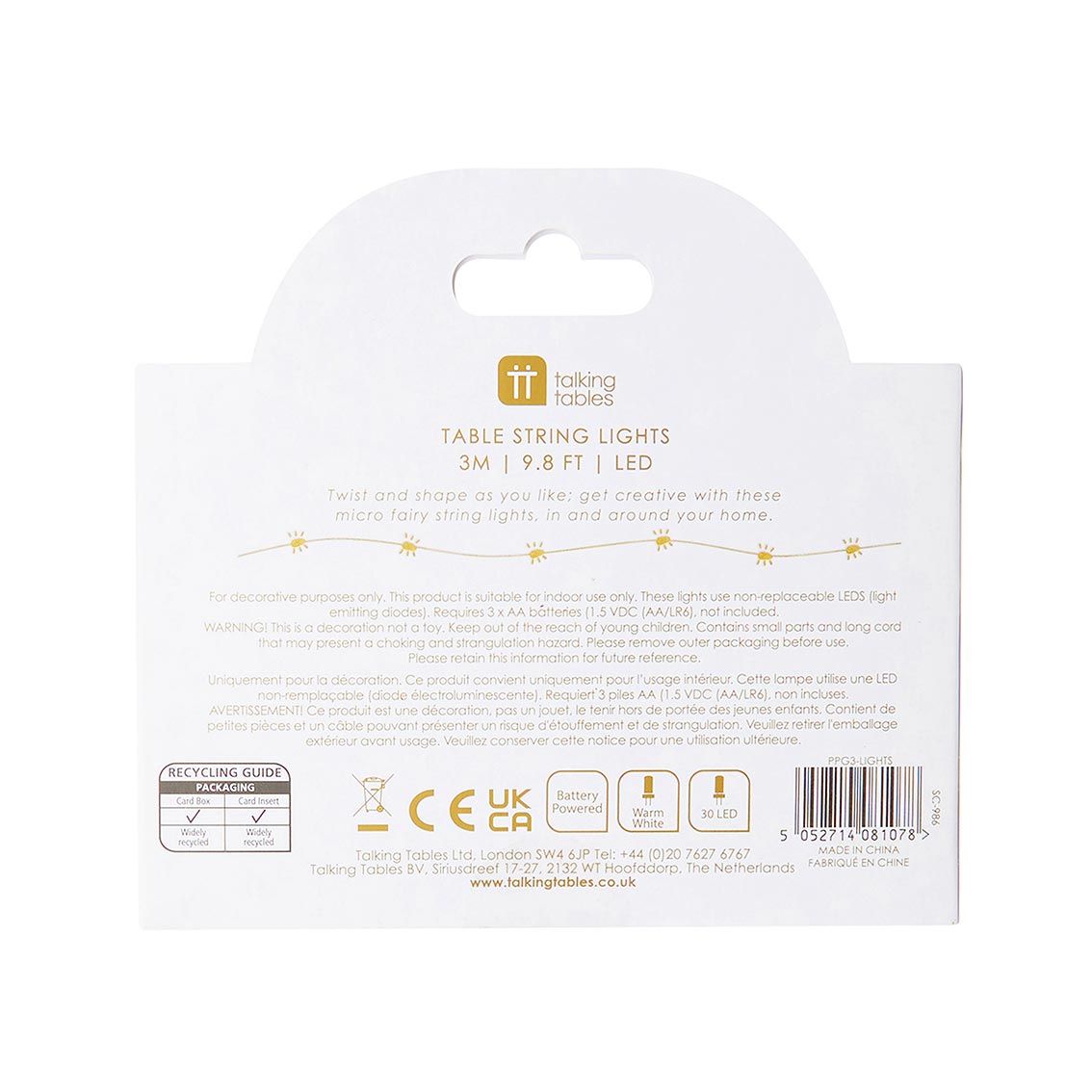 Add a warm glow to your table with these dainty String Lights by Talking Tables. These small LED lights are perfect for decorating your dinner table, mantlepiece, banister or in a jar as a table centrepiece! Each pack contains a 3m (10ft) string of white LED lights on a gold wire.