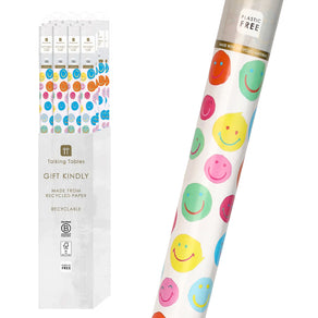 Add some fun to your customers' gift-giving with Happy Face Recycled Wrapping Paper. The original, multi coloured cheerful smiley design comes as a POS of 16 and is the eye-catching solution for wrapping birthday presents. Made from recycled paper, each wrap comes with an easy-to-tear paper zip seal, which removes the need for wrap stickers.