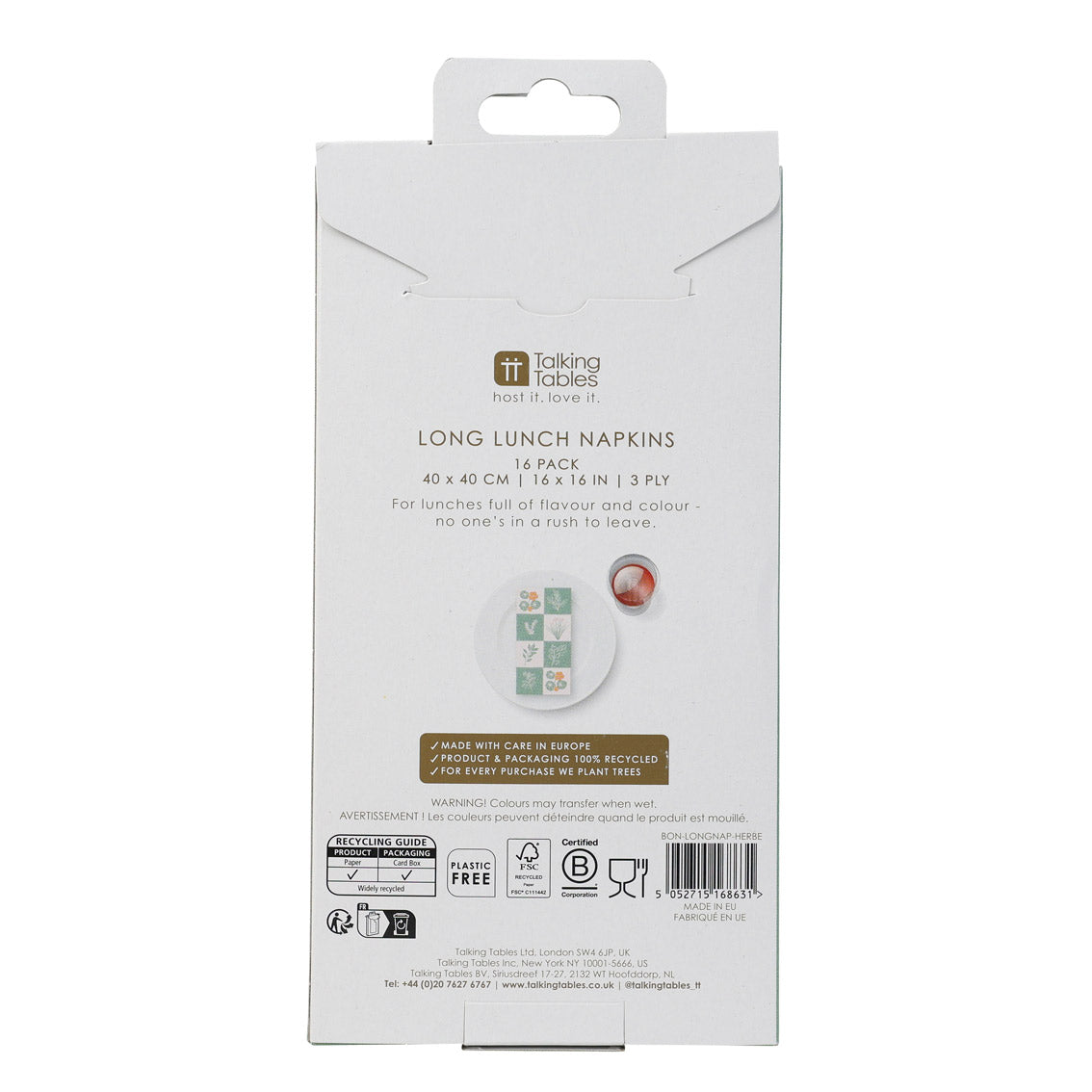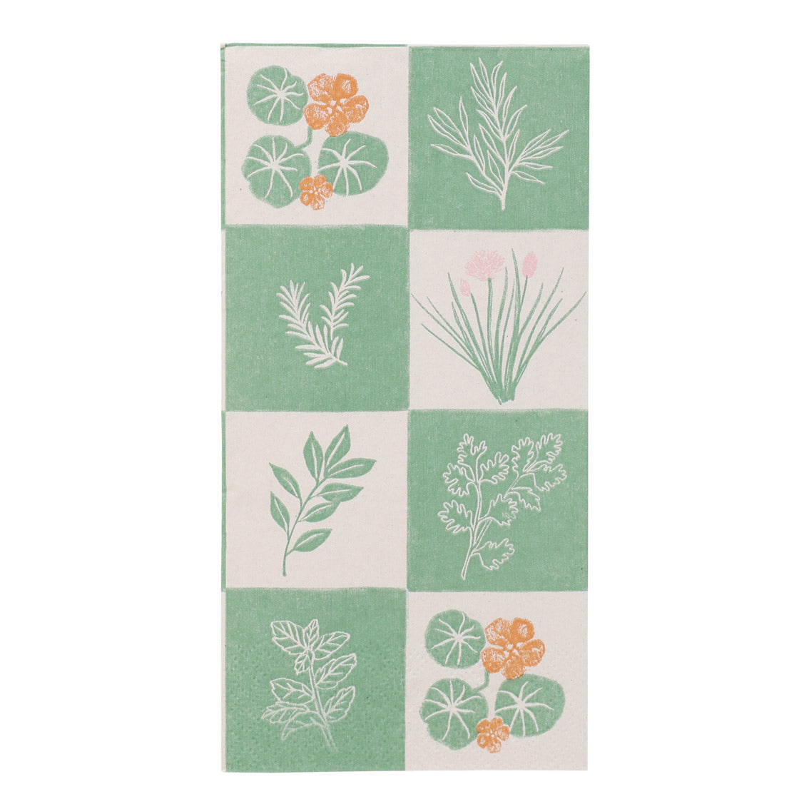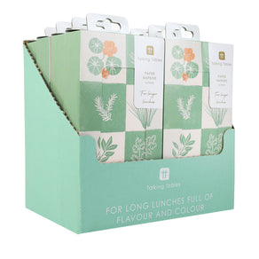 Designed within the Bon Jardin range, the Herb Long Lunch Paper Napkins bring a fresh, garden-inspired feel to the table. Featuring hand-drawn illustrations of herbs such as parsley, rosemary, and nasturtium on a painterly green and cream check background, the design captures the beauty of the kitchen garden in a soft, contemporary palette. Made from 3ply, 100% FSC® recycled paper, both napkins and packaging reflect a commitment to sustainability. Sized at 40cm, they’re ideal for long, relaxed lunches or al fresco dining.