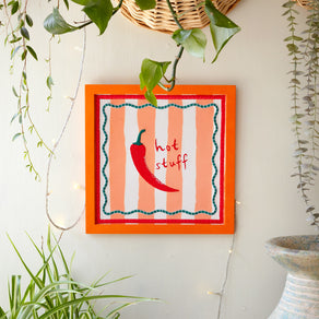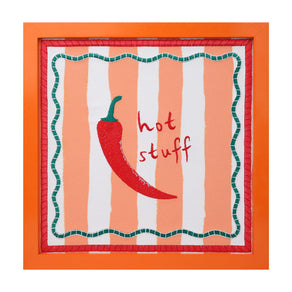 Add a spicy statement to any wall or shelf with the Hot Stuff Chilli Fabric Framed Sign. Featuring stitched detail on bold printed fabric, this framed sign brings foodie flair to kitchens, BBQ spaces or quirky gallery walls.