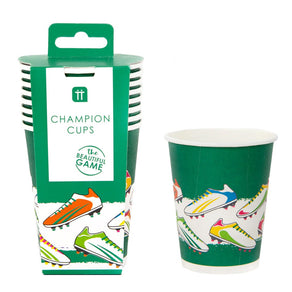 Raise a cup to the beautiful game with our Party Champions Recyclable Football Cups. Decorated with vibrant illustrations of studded football boots on a grass-green background, these cups are perfect for birthdays, tournaments, or summer screenings. Give your customers a chance to raise a recyclable cup to their favourite team and drink to victory with these football party cups.