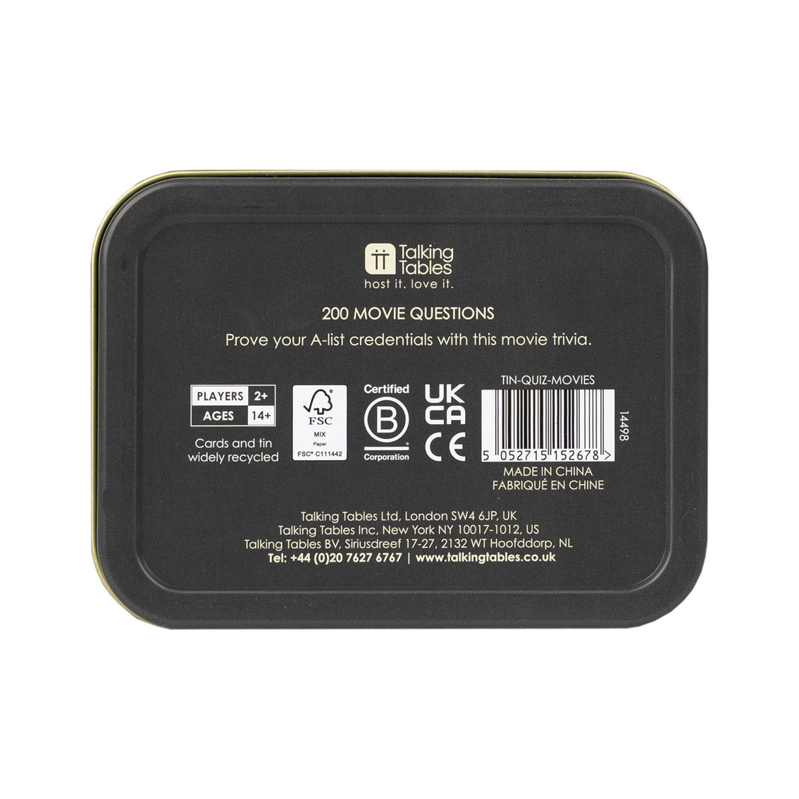 Lights, camera, action! Elevate your entertainment selection with our Quiz in a Tin - Movie Trivia. Challenge your customers' cinematic knowledge with a dazzling array of film-related questions spanning actors, directors, movie titles, and prestigious awards. This delightful pocket-sized game is a blockbuster addition to any after dinner gathering or movie night extravaganza with friends.