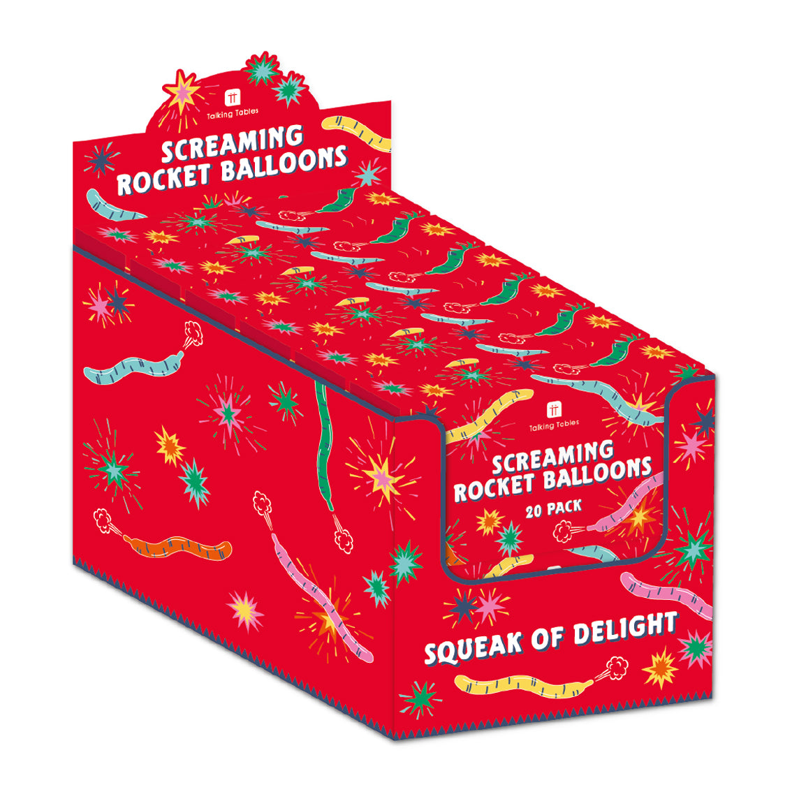 A high impact display packed with classic screaming rocket balloons designed to grab attention and drive impulse sales. Bright red display packaging is covered in bold starbursts and retro graphics, setting the tone for noisy, light hearted fun. Each balloon shoots off with an unpredictable flight path and signature screech, creating instant reactions and shared laughs. Built for energy, movement and repeat play.