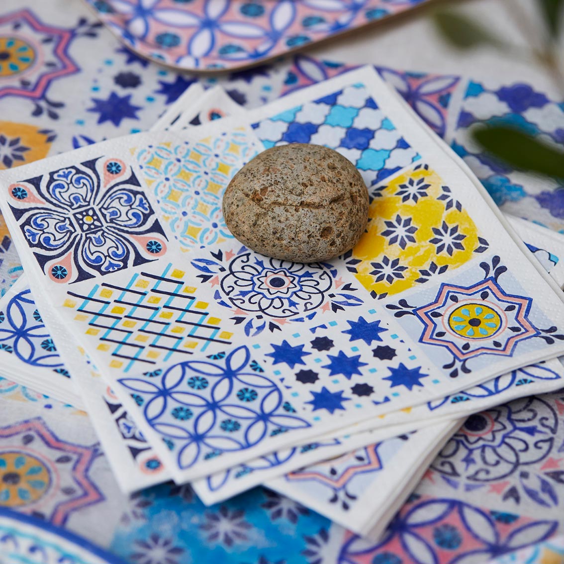 Inspired by Moroccan souks, these Souk Blue Paper Napkins display the geometric tile patterns of the famous bazaar markets. Combining perennial blue - one of Pantone's key colours for spring/summer 23 - with a sunshine yellow, they work well for a wide variety of spring and summer occasions - from picnics, to BBQs, to larger table settings. Also, for the particularly creative, they can be used for decoupage to create your own beautiful Moroccan tile table, chair, or coaster.