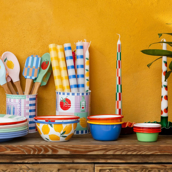 Style alongside the Bon Appetit collection for a fresh, seasonal display. Combine with coordinating enamel candle holders, serving trays and kitchen accessories to create an uplifting spring story in store. Perfect for adding colour to kitchenware or garden gift displays.