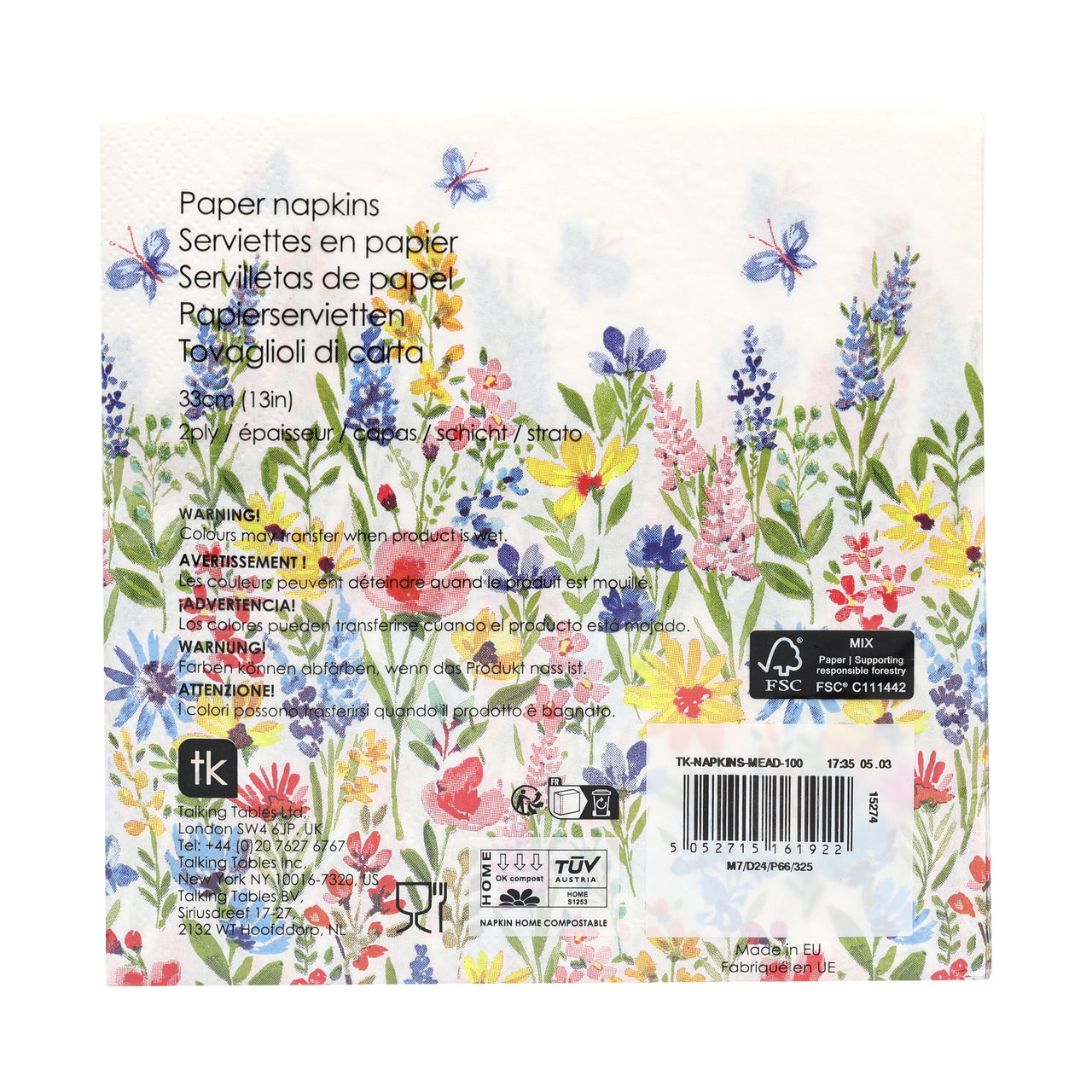 Bring the beauty of a wildflower meadow to your table with these premium eco paper napkins. Featuring a delicate design of blooming florals and fluttering butterflies, these napkins are part of our Table Kind range – crafted with both style and sustainability in mind. Manufactured in Europe and certified by the FSC, they are 100% recyclable and home compostable. They offer a soft, high-quality feel that’s ideal for hosting, everyday dining or professional catering.