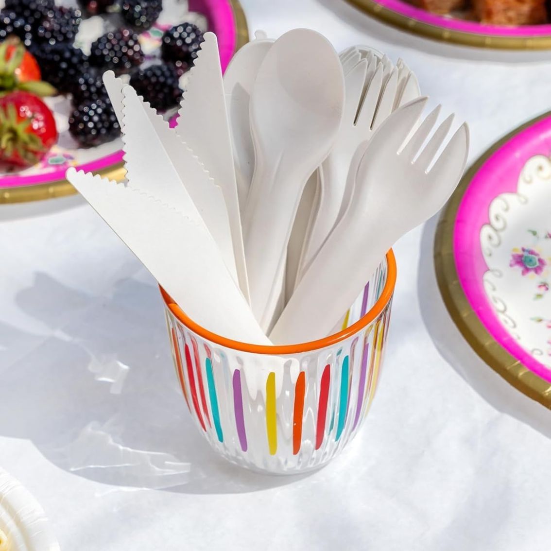 An eco-conscious alternative to single-use plastic, this 120-piece set of paper cutlery includes spoons, forks and knives crafted from FSC-certified paper sourced from sustainable forests. Designed to be sturdy for both hot and cold foods, they offer comfort in the hand with a smooth finish. Once used, they can be home composted or recycled, making them ideal for parties, picnics, and everyday dining.
